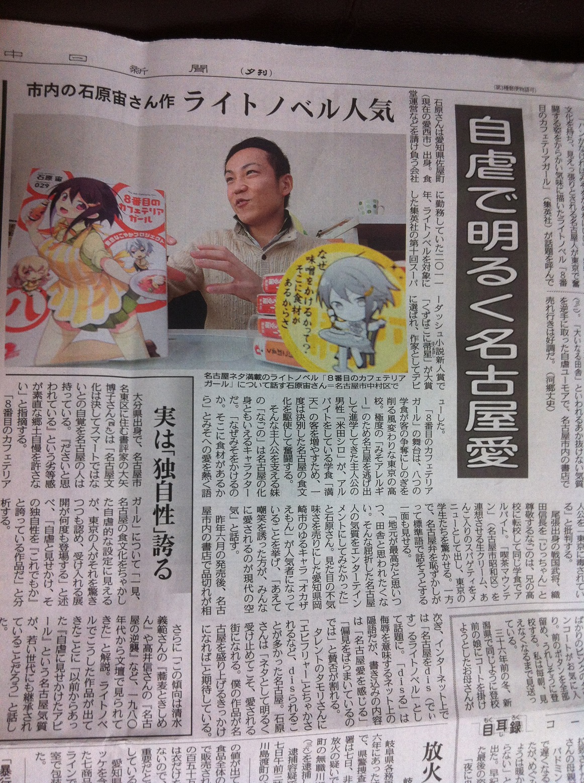 『8番目のカフェテリアガール』というのは基本的に馬鹿馬鹿しい馬鹿な話なんですが、新聞記事という体裁のためか、「日本における名古屋の立ち位置とは」とか「dis≒愛という現代的ネット文化」とか記者さんの質問がなかなか社会的なアプローチで、正直難しいことは全然考えず馬鹿みたいに書いていたので、戸惑いつつ必死に答えました。